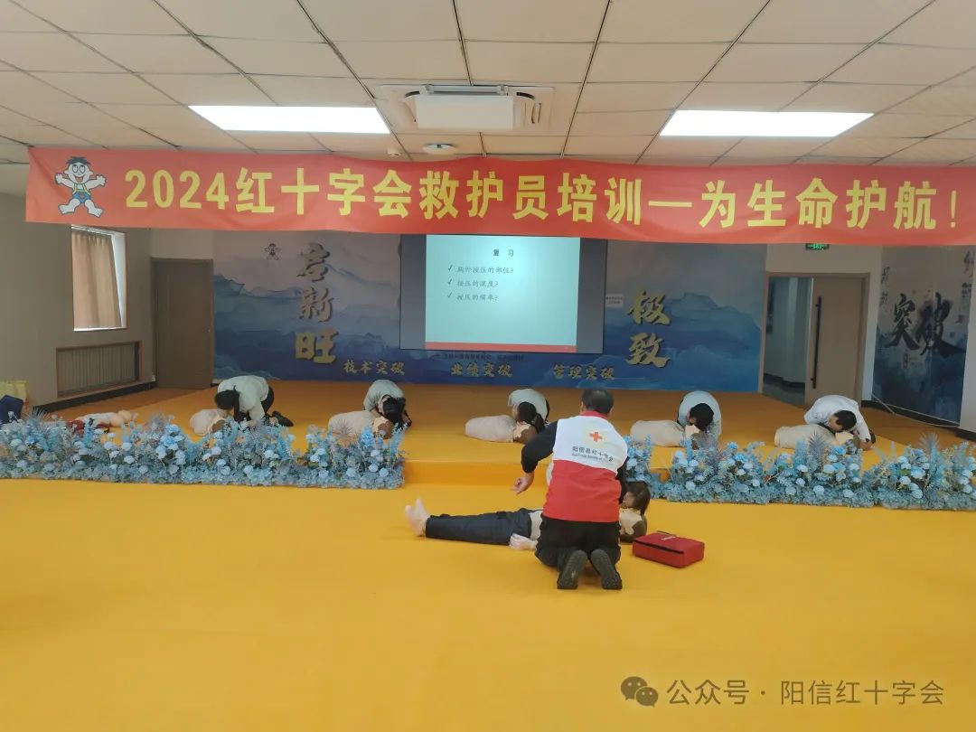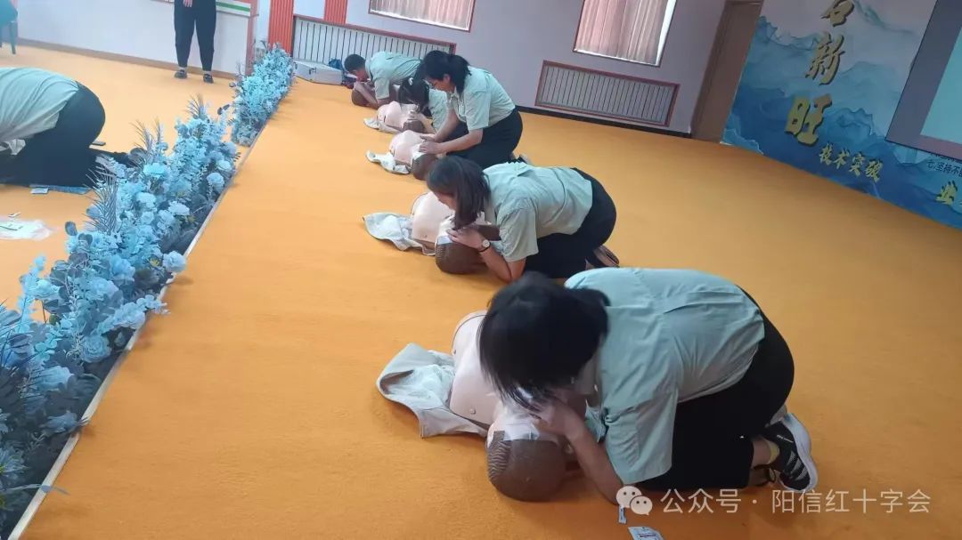 培训现场,县红十字会应急救护培训老师讲解了应急救护的重要意义,运用理论授课与现场操作演示相结合 的方式,讲解了心肺复苏操作步骤、自动体外除颤器(AED)使用方法,海姆立克急救法和包扎等急救技能,并利用模拟假人演示具体的操作方法和动作技巧,手把手指导学员进行实践操作,学员们学习热情高涨,学习氛围浓厚,取得了良好的培训效果。