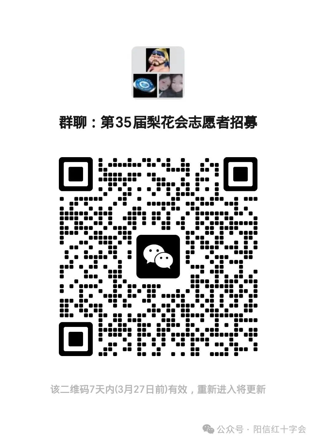 方式一:识别群二维码,加入梨花会红十字志愿者微信群(申请时请注明志愿者,加群后请备注姓名和手机号)